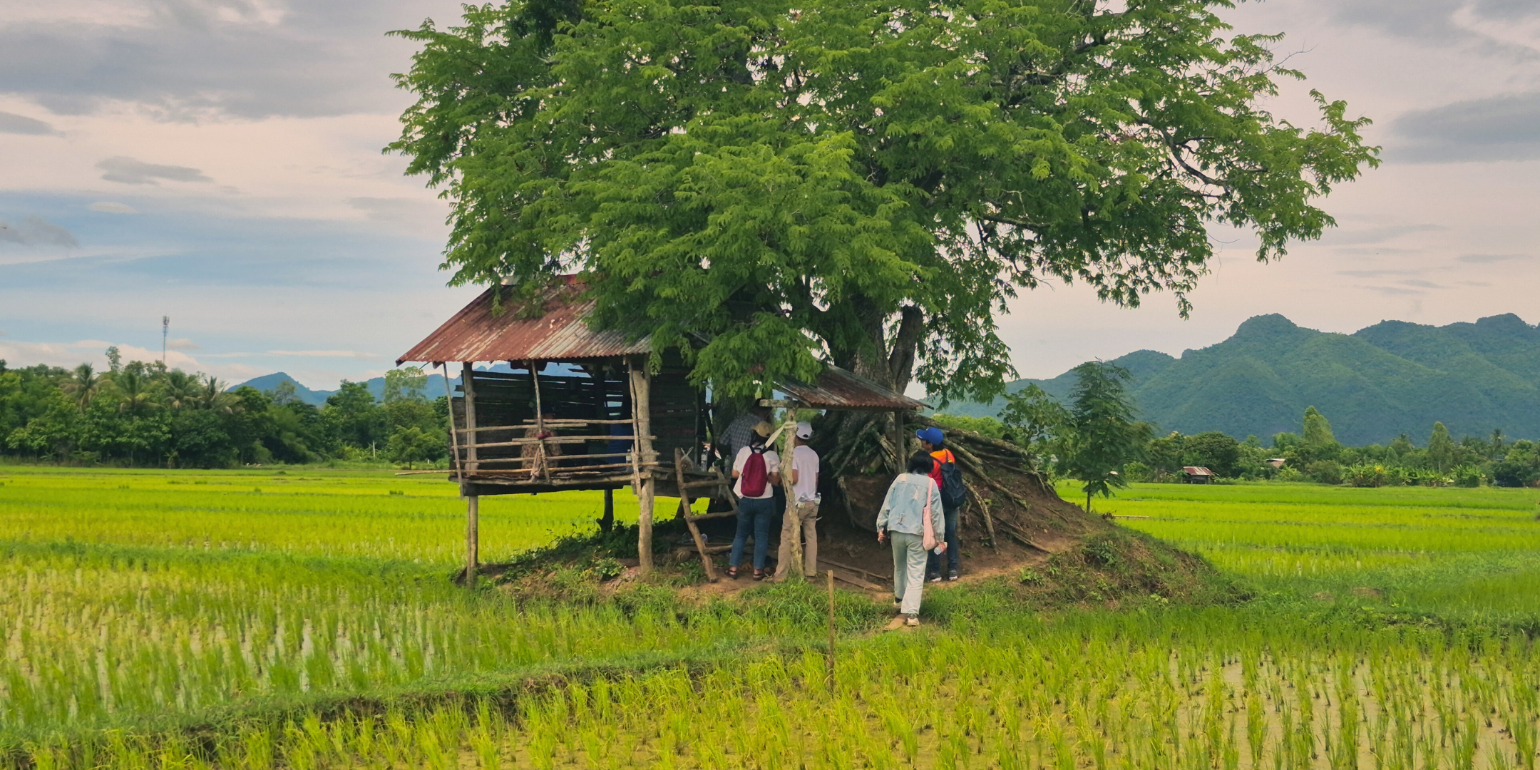 เสียงท้องร้องเริ่มกวนใจหลังจากที่เราไหว้พระเสร็จแล้ว ถึงจะอิ่มบุญแต่เมื่อในท้องมีเพียงกาแฟแก้วเดียวก็คงไม่เพียงพอสำหรับเป็นพลังงานเพื่อเดินทางตลอดทั้งวัน นับเป็นเรื่องดีที่พี่กุลบอกกับพวกเราว่า เราจะไปกินข้าวกันในสถานที่ถัดไป แต่ครั้งนี้เราไม่ได้เดินทางต่อด้วยรถอีแต๋นคันเดิมและไม่ได้เดินเท้าไป เพราะจักรยานที่เรียงรายจอดรออยู่หน้าต้นเฉลียงนั้นคือพาหนะที่พร้อมให้พวกเราปั่นมันออกไปเพื่อสัมผัสกับวิถีชีวิตของคนในชุมชนในวันนี้ด้วยและนี่คืออีกหนึ่งไฮไลต์ของวันนี้ เราค่อย ๆ ปั่นจักรยานลัดเลาะไปตามถนนเส้นเล็ก ๆ สายหนึ่งของหมู่บ้าน บ้านไม้ชั้นเดียวและสองชั้นเรียงรายตลอดทางสลับกับร้านขายของในชุมชน ปรากฏเป็นวิถีชีวิตเรียบง่ายที่คงไม่สามารถพบเห็นประสบการณ์แบบนี้ได้ในเมืองใหญ่ เมื่อปั่นจักรยานมาได้สักระยะ สิ่งที่ทำให้ผู้เขียนและเพื่อนร่วมทริปหลายคนอดไม่ได้ที่จะหยิบโทรศัพท์ขึ้นมาถ่ายรูปไว้เป็นที่ระลึก ก็คือภาพของทุ่งนากว้างที่ถูกโอบล้อมด้วยแนวภูเขาไกลสุดสายตา ยิ่งไปกว่านั้น เรายังโชคดีที่มาในช่วงที่ชาวบ้านเพิ่งปักกล้าลงนา ท้องทุ่งทั้งผืนจึงเต็มไปด้วยสีเขียวอ่อนของต้นข้าวอ่อนที่เรียงตัวแน่นเต็มผืนดิน สะท้อนแดดยามสายอย่างอ่อนโยน เสียงพูดคุยของชาวบ้านที่กำลังทำหน้าที่ของตนเองอย่างขมักเขม้น ลอยมากับสายลมแผ่วเบา บ้างหัวเราะ บ้างส่งเสียงเรียกกันอย่างเป็นกันเอง ความเคลื่อนไหวที่เกิดขึ้นรอบตัวดูเชืองช้า ไม่เร่งรีบ แตกต่างจากจังหวะชีวิตในเมืองใหญ่ และแล้วสองเท้าที่ปั่นจักรยานมาตลอดเส้นทางก็หยุดลง เป็นสัญญาณบอกว่าเรามาถึงจุดหมายแล้ว แต่จุดนี้ยังไม่ใช่สถานที่สำหรับนั่งกินข้าวเสียทีเดียว พี่กุลบอกกับเราว่ายังต้องเดินเท้าลัดเลาะต่อไปตามคันนาเล็ก ๆ เพื่อไปยังเถียงหน้ากลางทุ่ง แน่นอนว่าในเมื่อมาถึงที่แล้ว สายลุยอย่างเราจะพลาดได้อย่างไร หลังจากเก็บภาพบรรยากาศโดยรอบจนพอใจ ก็รีบก้าวเท้าเดินตามคนข้างหน้าไปทันที ระยะทางจากจุดจอดจักรยานเข้าไปยังที่หมายอาจไม่ใกล้ไม่ไกลนัก แต่เมื่อมีวิวทุ่งนาเปิดโล่งทอดยาวอยู่ตรงหน้า กับภูเขาสูงเป็นฉากหลัง การก้าวเดินไปพร้อมกับใช้สายตาที่ทอดมองธรรมชาติรอบตัวแบบนี้ ต่อให้ไกลกว่านี้ก็ไม่มีบ่น เมื่อมาถึงเถียงนาไม้กลางทุ่ง ที่หมายของมื้อนี้ บรรยากาศก็อบอวลไปด้วยความเรียบง่ายและอบอุ่น น้อง ๆ ทีมงานเริ่มลงมือจัดเตรียมอาหารอย่างขะมักเขม้น เมนูอาหารพื้นบ้านวางเรียงราย ทั้งต้มไก่กลิ่นหอม คั่วปลารสเข้ม น้ำพริกผัก